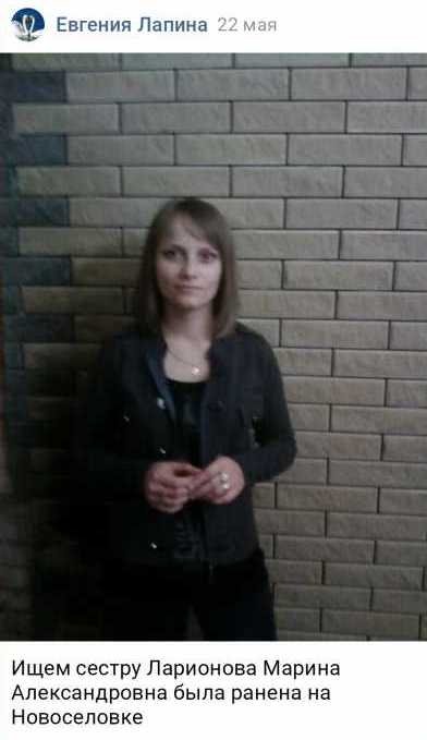• Шукаємо сестру Ларіонова Марина Олександрівна, 06.11.1987. Була поранена 14 березня, зі слів сусідів її підхватили воєнні і повезли до лікарні. Цевільна